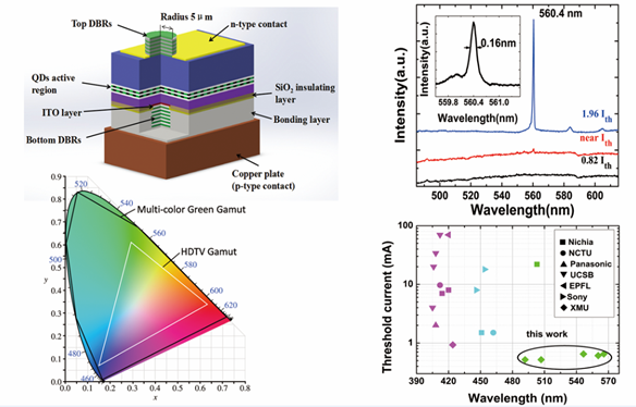 本课题组采用了新颖的InGaN量子点材料代替量子阱作为VCSEL有源发光区,并且引入了热导率很高的铜基板,成功研制出室温下连续工作的绿光VCSEL。InGaN量子点材料有着量子限制斯塔克效应小、发光效率高、局域效应强等优点。通过优化谐振腔设计、减小腔内损耗、匹配光场与有源区的耦合,获得了目前波长最长的GaN基VCSEL并且具有极低的阈值电流密度。另外,通过调整VCSEL的谐振腔长度,成功实现了对VCSEL波长的调控,得到了492-565nm范围内的绿光激射,这对于宽色域激光全色显示有着重大意义。