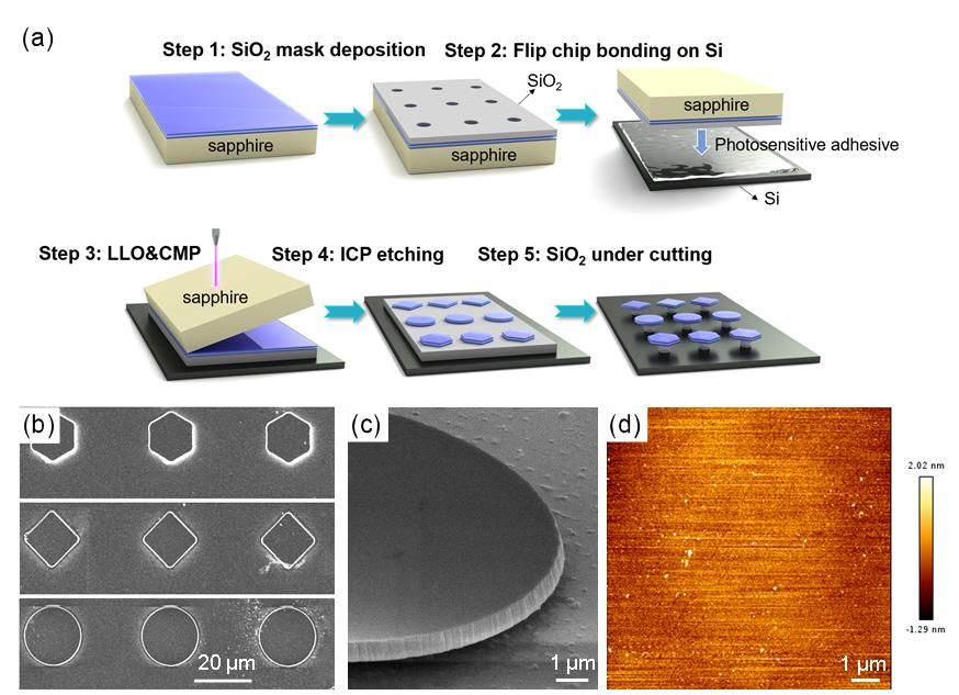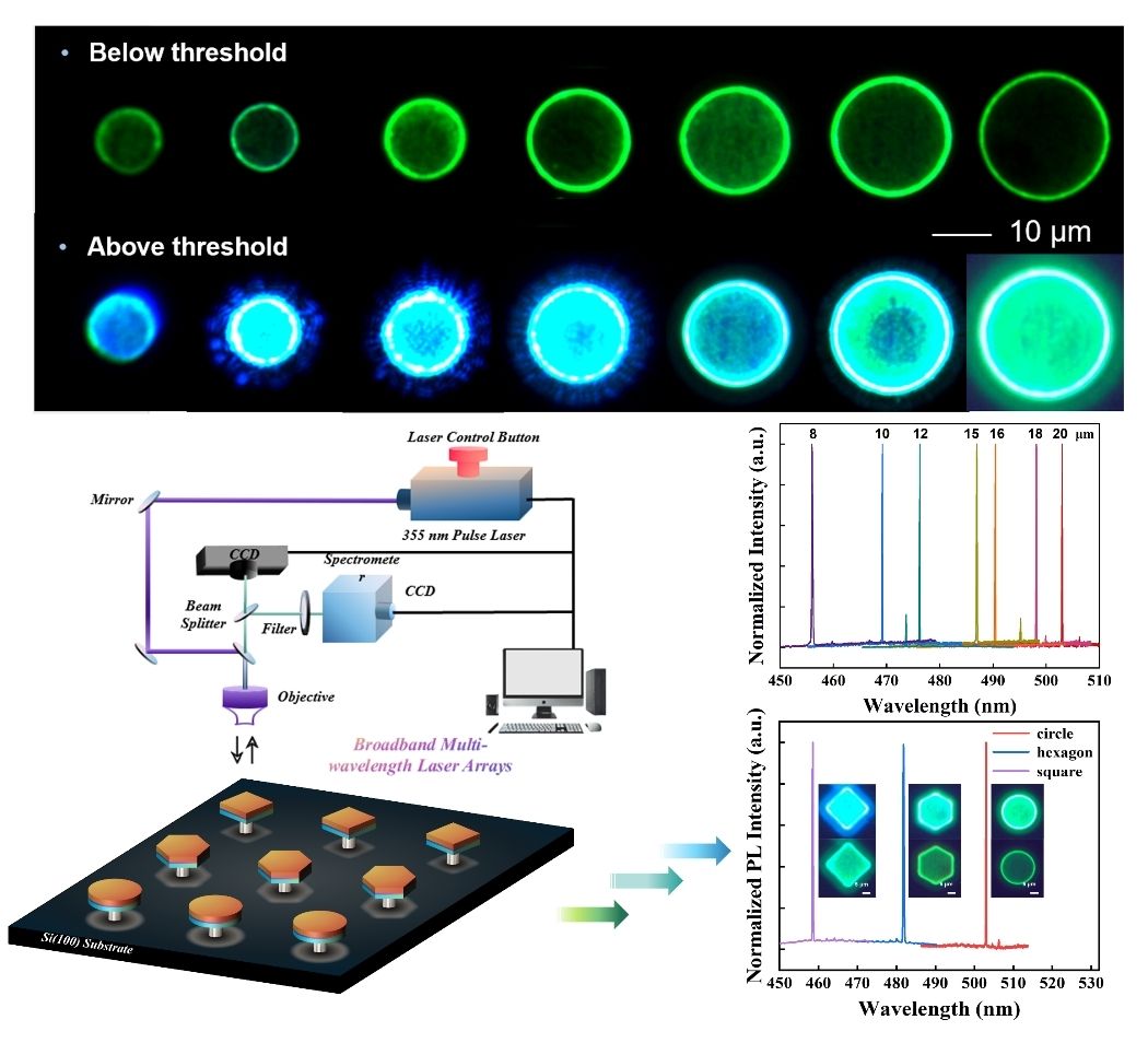 针对上述问题,张保平教授课题组提出了一种创新的理论模型与制备工艺,在硅(100)衬底上成功实现了GaN基微盘激光器阵列的片上集成。在室温条件下,该微盘激光器表现出优异的性能,其品质因子(Q值)高达13138,阈值低至57.85 μJ/cm²,发射波长位于绿光波段。团队系统研究了微腔尺寸与几何形状对激射行为的影响,通过调控微腔损耗,实现了从456 nm至503 nm宽光谱范围内的可控制备与片上集成。这一突破性进展为Si-PIC平台的片上集成宽带多波长激光源的实现开辟了一条新途。