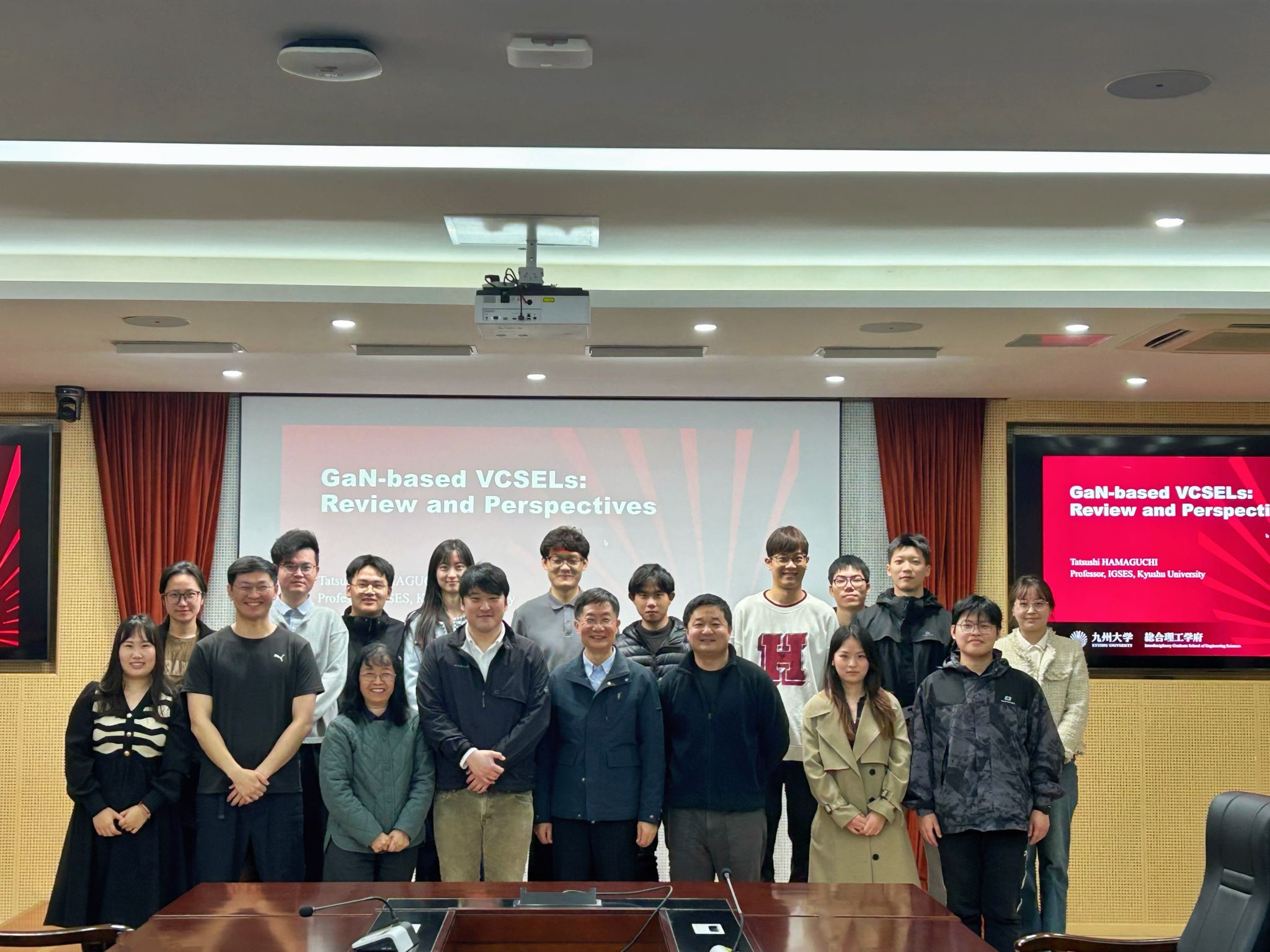 讲座中,滨口教授首先介绍了九州大学 Hamaguchi Lab 的研究布局与核心方向,随后系统梳理了氮化镓基垂直腔面发射激光器(VCSEL)的发展脉络,结合自身在产业界的实践经验,细致分享了蓝光、绿光波段器件研发中的关键技术突破与工程化经验。在交流环节,现场学习氛围浓厚,师生们围绕器件性能优化等问题踊跃提问,滨口教授逐一耐心解答,为大家厘清了技术难点与发展思路。会后,滨口教授与厦门大学师生合影留念,本次学术讲座在热烈的氛围中圆满落幕。