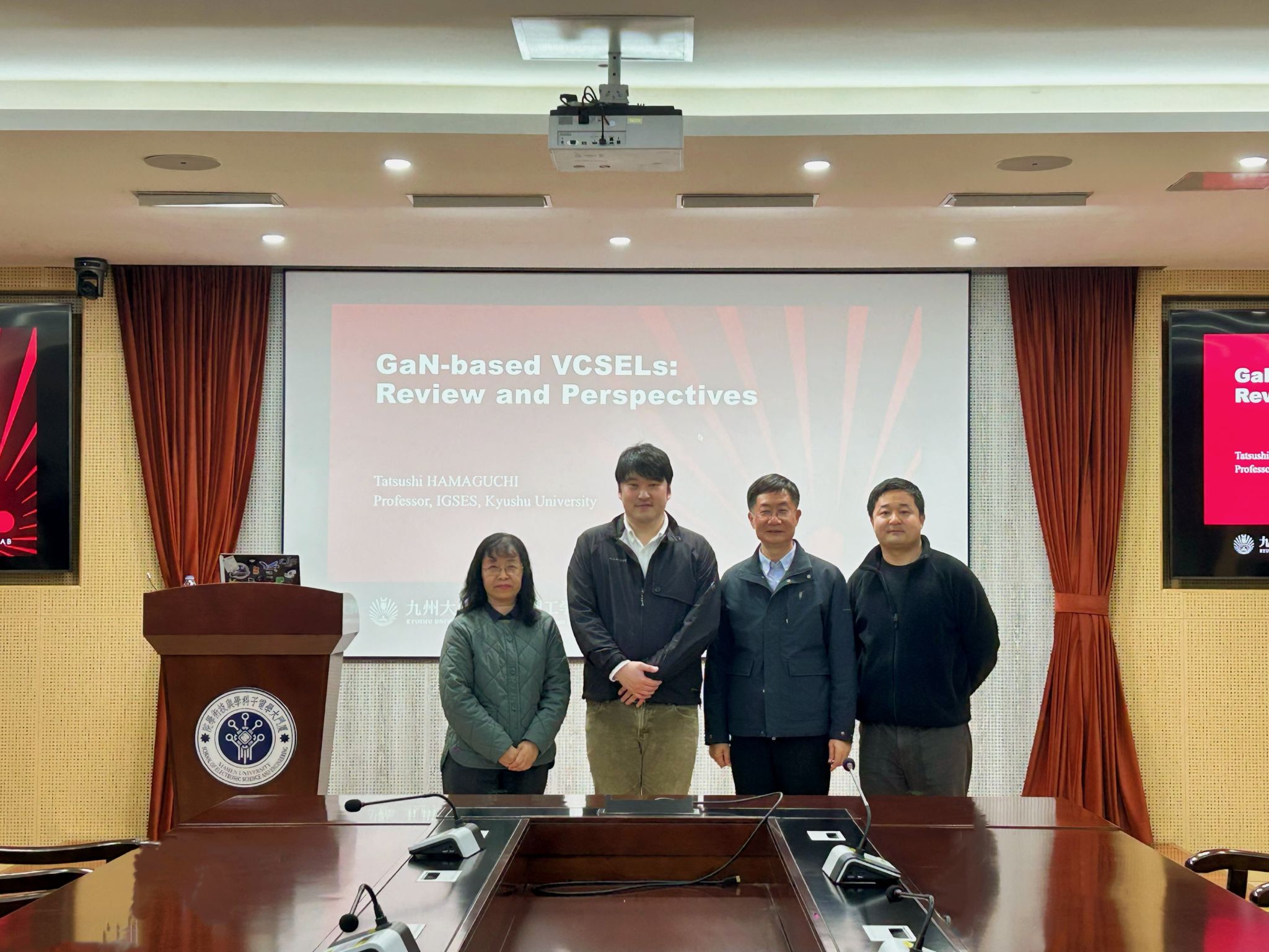 讲座中,滨口教授首先介绍了九州大学 Hamaguchi Lab 的研究布局与核心方向,随后系统梳理了氮化镓基垂直腔面发射激光器(VCSEL)的发展脉络,结合自身在产业界的实践经验,细致分享了蓝光、绿光波段器件研发中的关键技术突破与工程化经验。在交流环节,现场学习氛围浓厚,师生们围绕器件性能优化等问题踊跃提问,滨口教授逐一耐心解答,为大家厘清了技术难点与发展思路。会后,滨口教授与厦门大学师生合影留念,本次学术讲座在热烈的氛围中圆满落幕。
