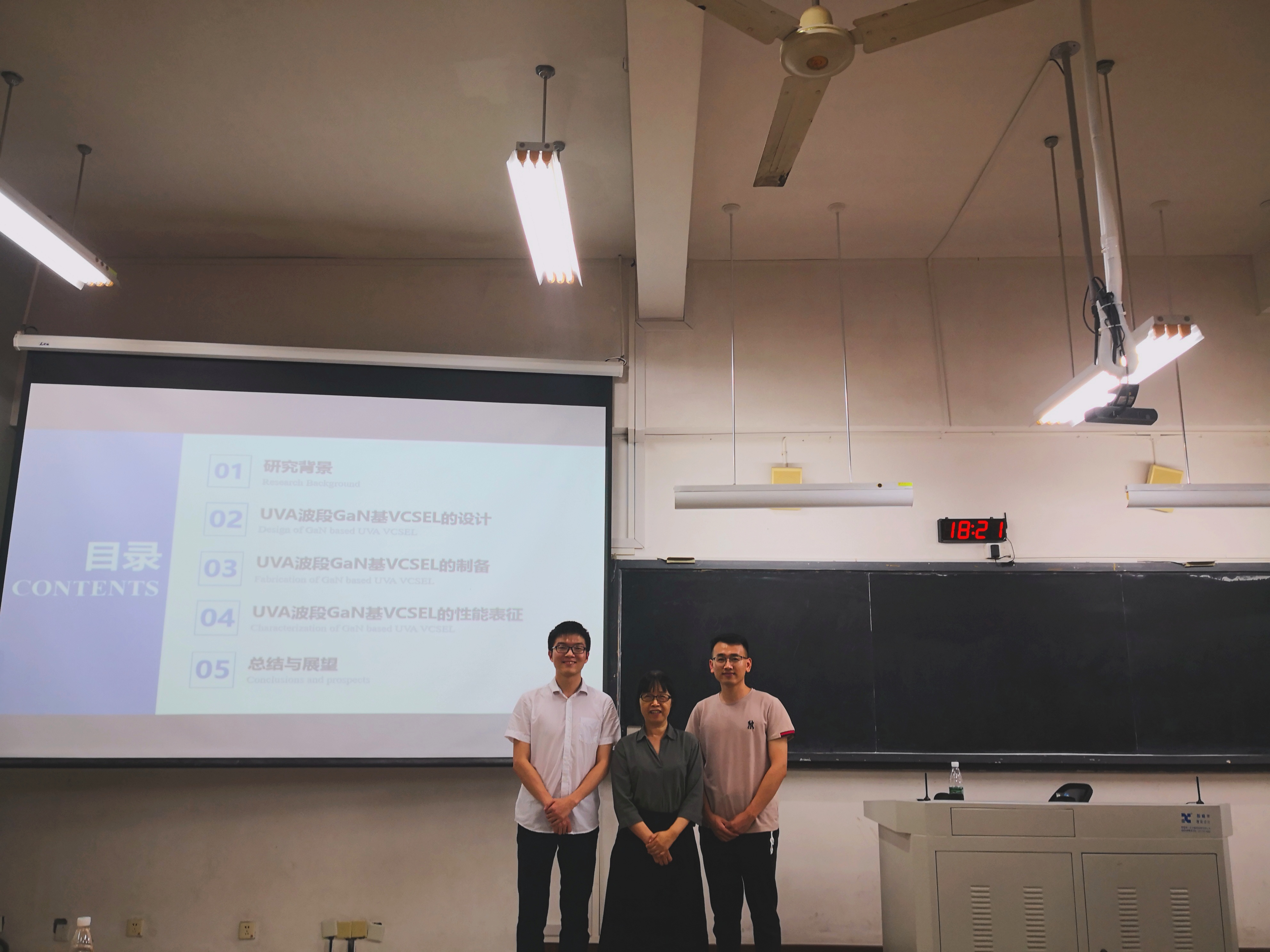 实验室成员杨天瑞(左)完成了题为“UVA波段GaN基垂直腔面发射激光器研究”的硕士学位论文答辩,苏旭良(右)完成了题为“自分裂InGaN蓝光垂直结构LED的制备及性能分析”的硕士学位论文答辩。